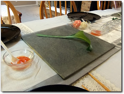 초대를 받아서 식사를 하려고 하자 처음으로 압도된 것은 식탁의 데코레이션이었습니다. 사실 저희 가족 자체가 데코레이션을 하고 먹어본 적도 없으려니와 개인적으로 식탁 데코레이션은 음식에서 밀리는 것을 장식으로 만회하려는 기술이 아닌가 하는 선입관이 있어 별로 깊은 인상을 받아본 적이 없었는데 대리석과 비슷한 질감의 돌판위에 선이 매우 날렵한 잎이 하나 올라와 있으니 첫인상이 매우 강렬하더군요. 심상치 않은 내공이 느껴집니다. 미국에서는 흔히 Zen Style 이라는 단어로 표현하곤 하는데 정말 예뻤습니다. 이는 이후에 올라오는 음식들 사이에 놓여져 있는 예쁜 꽃들과 버무려져서 더욱 아름다웠습니다.